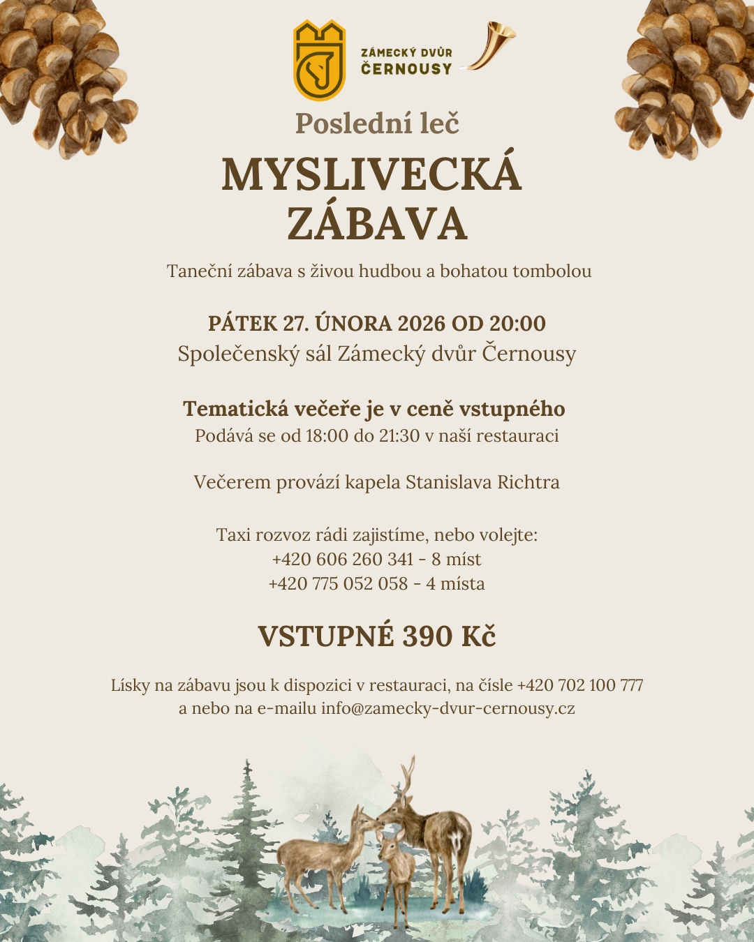 MYSLIVECKÁ ZÁBAVA – Poslední leč 26. 2. 2026 od 20:00 na společenském sále v Zámeckém dvoře Černousy