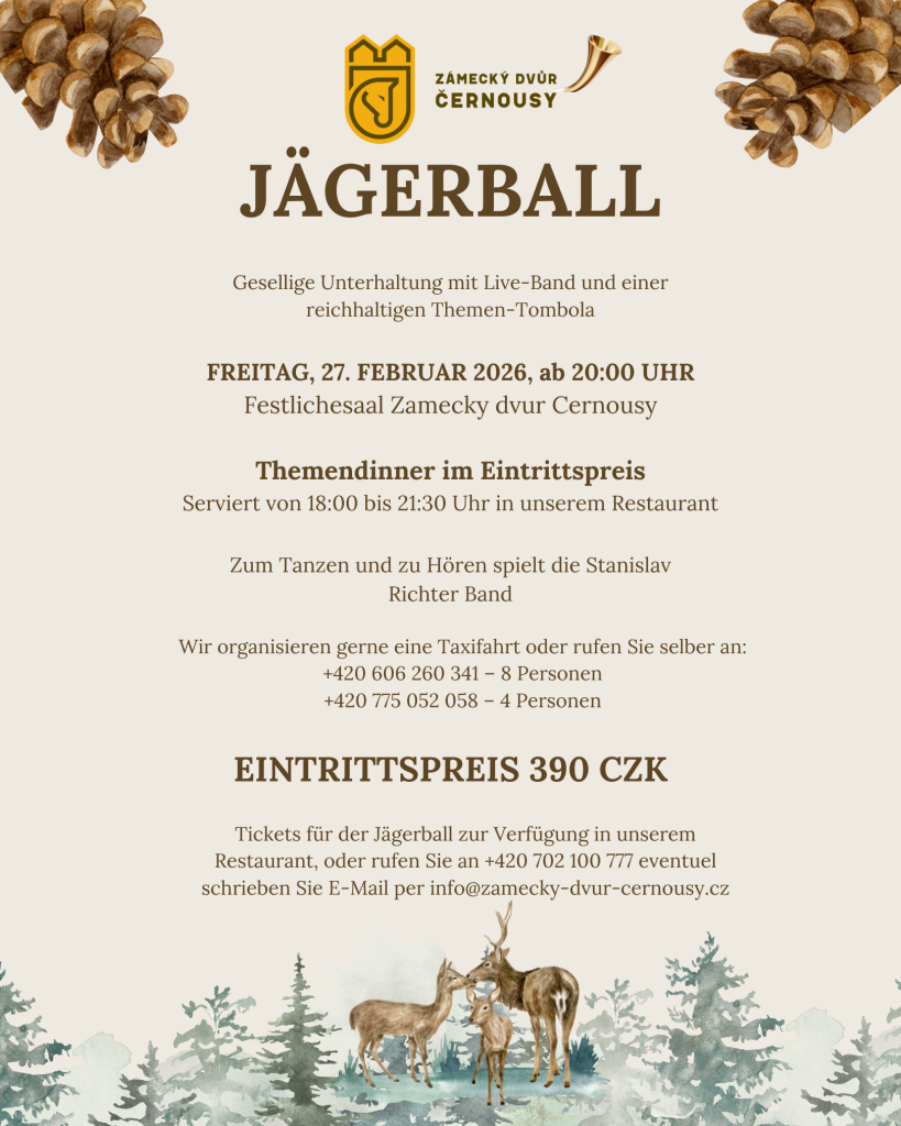 MYSLIVECKÁ ZÁBAVA – Poslední leč 26. 2. 2026 od 20:00 na společenském sále v Zámeckém dvoře Černousy