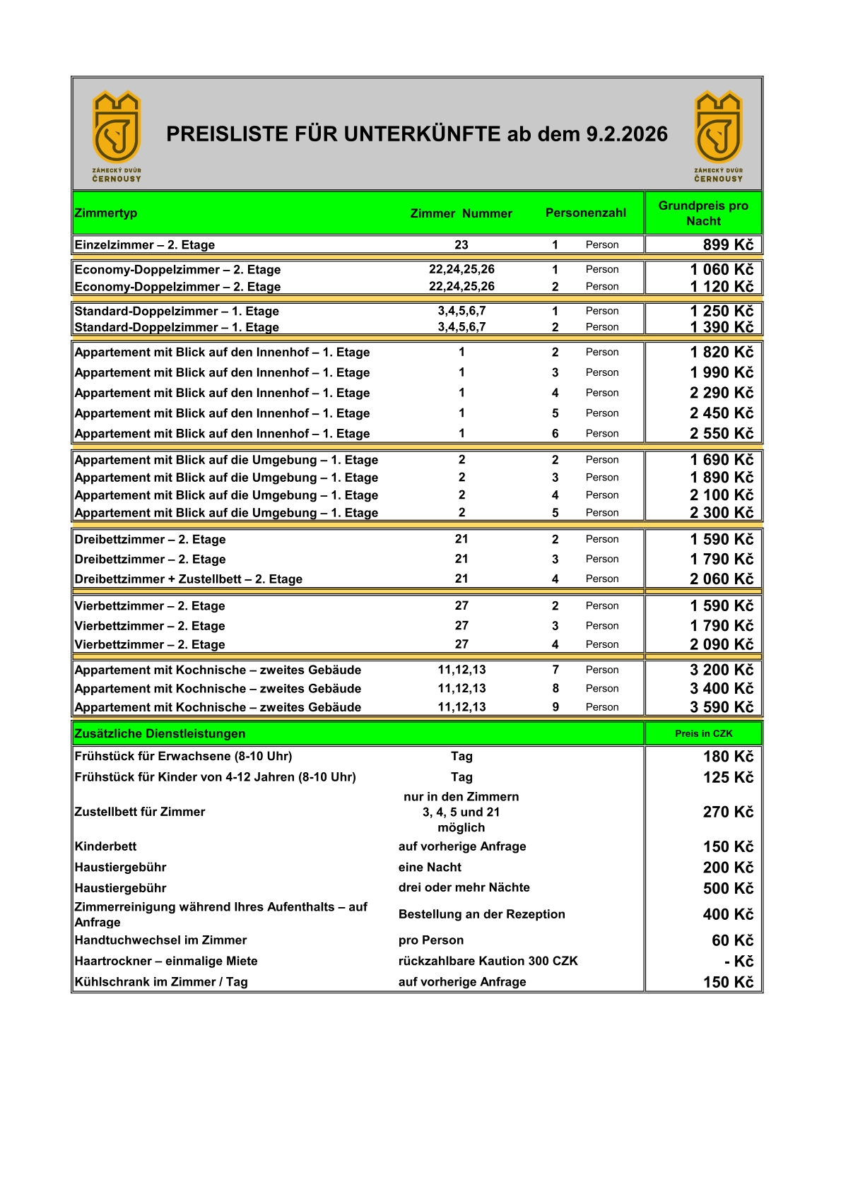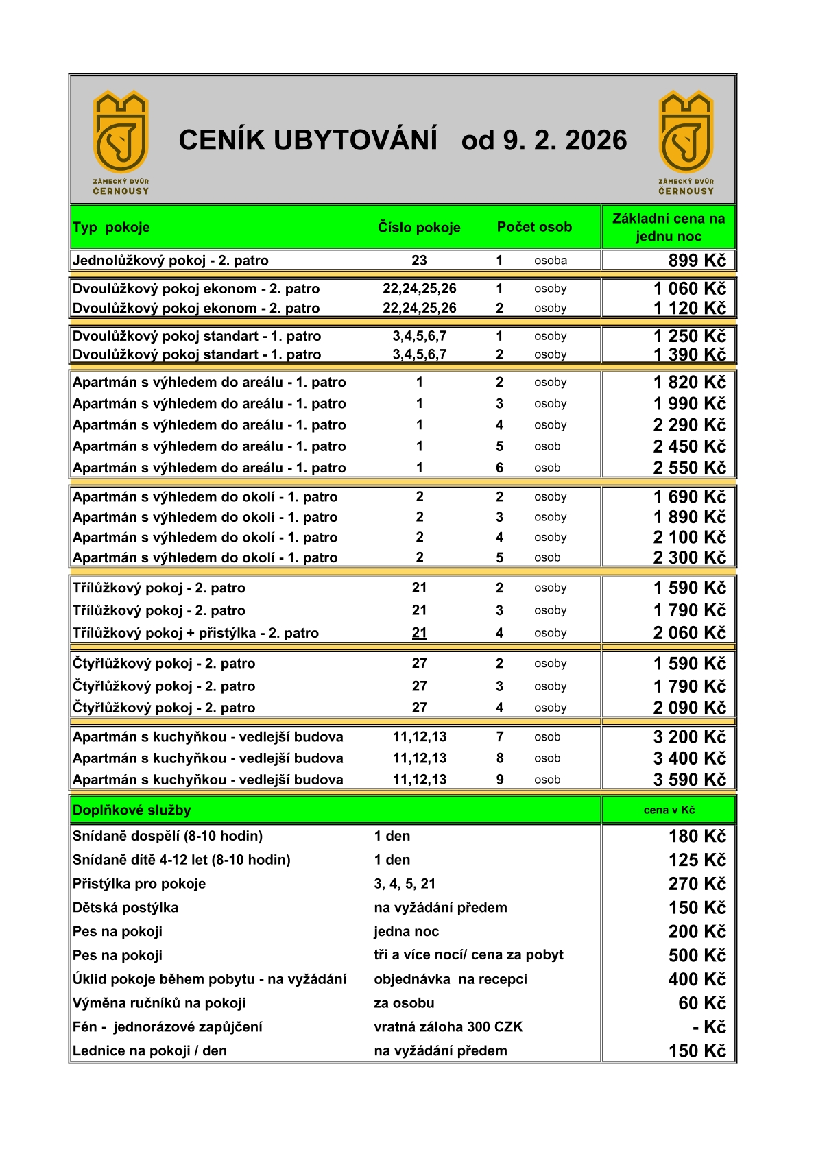 Nabízíme možnost ubytování se snídaní. Každý pokoj či apartmán má vlastní koupelnu se sprchovým koutem a toaletou. V ceně ubytování jsou zahrnuty lůžkoviny, ručníky, osušky a připojení k internetu pomocí Wi-Fi sítě, nebo datového kabelu. Využít můžete také monitorované parkoviště a dětské hřiště. Pokoje jsou vybaveny televizorem s 15ti českými programy a možností přehrávání vlastních multimédií z vašeho USB disku.