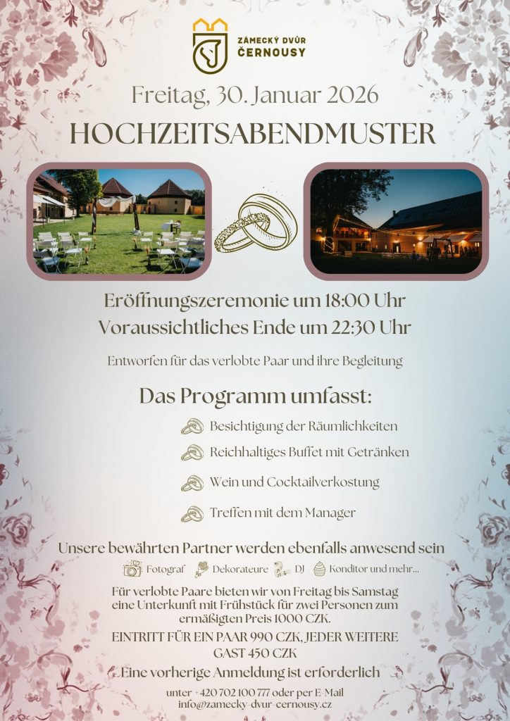 30. 1. 2026 od 18:00 zveme všechny snoubence a jejich nejbližší, na každoroční vzorový svatební večer.